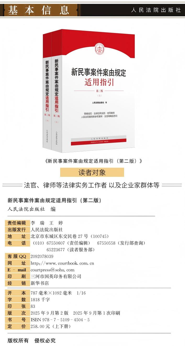 为深入践行司法为民宗旨、贯彻实施《民法典》, 2020年12月,最高人民法院公布了新《民事案件案由规定》,自2021年1月1日起与《民法典》同步施行。我社基于人民法院当前司法实践经验,适时推出了《新民事案件案由规定适用指引(2023年版)》,为法院干警和相关法律从业人员开展民事立案、诉讼等工作提供参照指引。该书出版后深受广大读者的好评和欢迎,热销不断,实现多次加印。应广大读者的强烈呼声,2025年,我社在前版的基础上,对本书进行全面整合修订,现推出《新民事案件案由规定适用指引(第二版)》。