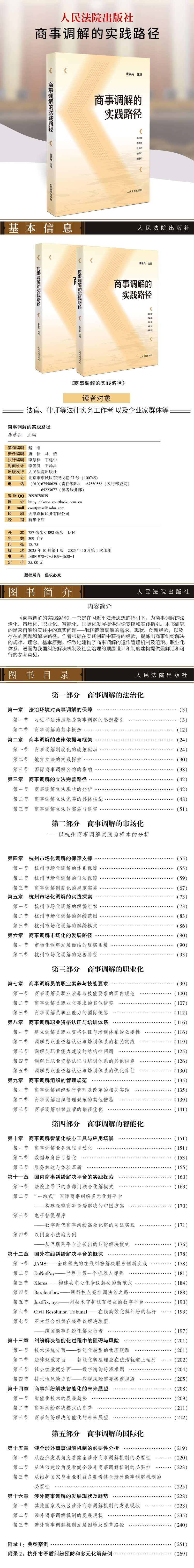 《商事调解的实践路径》一书是在习近平法治思想的指引下,为商事调解的法治化、市场化、职业化、智能化、国际化发展提供理论支撑和实践指引。本书研究的是来自解纷实践中的真实问题——我国商事调解的需求、现状、创新经验,以及存在的问题和解决路径。作者根据在实践创新中获得的经验,提炼出商事纠纷解决的规律、理念、基本原则,细致地建构了商事调解的运作管理机制及组织、职业化体系,进而为我国纠纷解决机制及社会治理的顶层设计和制度建构提供最鲜活和可行的参考意见。