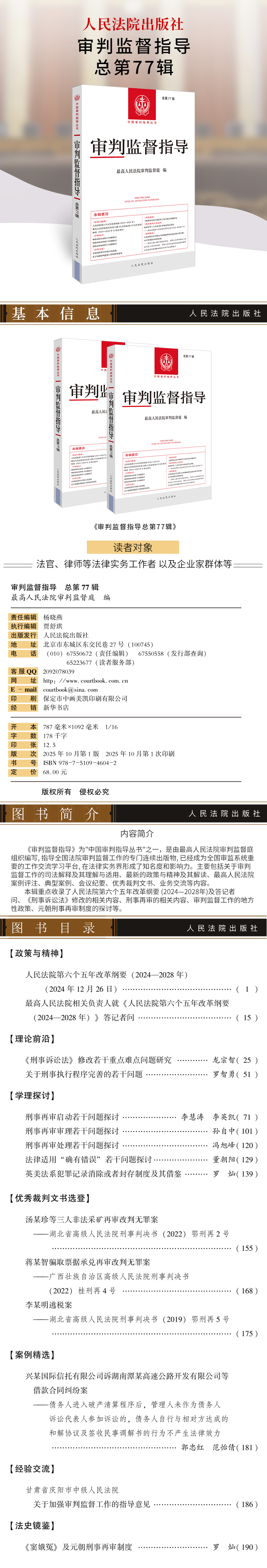 《审判监督指导》为"中国审判指导丛书"之一,是由最高人民法院审判监督庭组织编写, 指导全国法院审判监督工作的专门连续出版物, 已经成为全国审监系统重要的工作交流学习平台, 在法律实务界形成了知名度和影响力。主要包括关于审判监督工作的司法解释及其理解与适用、最新的政策与精神及其解读、最高人民法院案例评注、典型案例、会议纪要、优秀裁判文书、业务交流等内容。