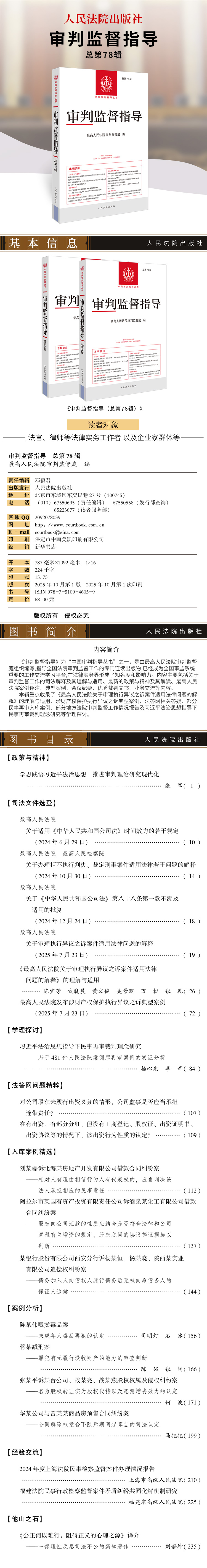 《审判监督指导》为“中国审判指导丛书”之一,是由最高人民法院审判监督庭组织编写,指导全国法院审判监督工作的专门连续出版物,已经成为全国审监系统重要的工作交流学习平台,在法律实务界形成了知名度和影响力。内容主要包括关于审判监督工作的司法解释及其理解与适用、最新的政策与精神及其解读、最高人民法院案例评注、典型案例、会议纪要、优秀裁判文书、业务交流等内容。