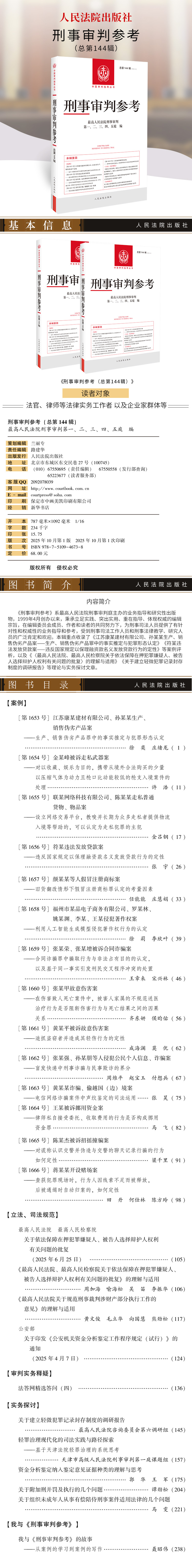 《刑事审判参考》系最高人民法院刑事审判庭主办的业务指导和研究性出版物,1999年4月创办以来,秉承立足实践、突出实用、重在指导、体现权威的编辑宗旨,在编辑委员会成员、作者和读者的共同努力下,为刑事司法人员提供了有针对性和权威性的业务指导和参考,受到刑事司法工作人员和刑事法律教学、研究人员的广泛肯定和欢迎。本辑重点收录了《江苏康某建材有限公司、孙某某生产、销售伪劣产品案——生产、销售伪劣产品罪中的事实推定与犯罪形态认定》《符某违法发放贷款案——违反国家规定以保理融资款名义发放贷款行为的定性》等案例评析,以及《〈最高人民法院、最高人民检察院关于依法保障在押犯罪嫌疑人、被告人选择辩护人权利有关问题的批复〉的理解与适用》《关于建立轻微犯罪记录封存制度的调研报告》等理论与实务探讨文章。