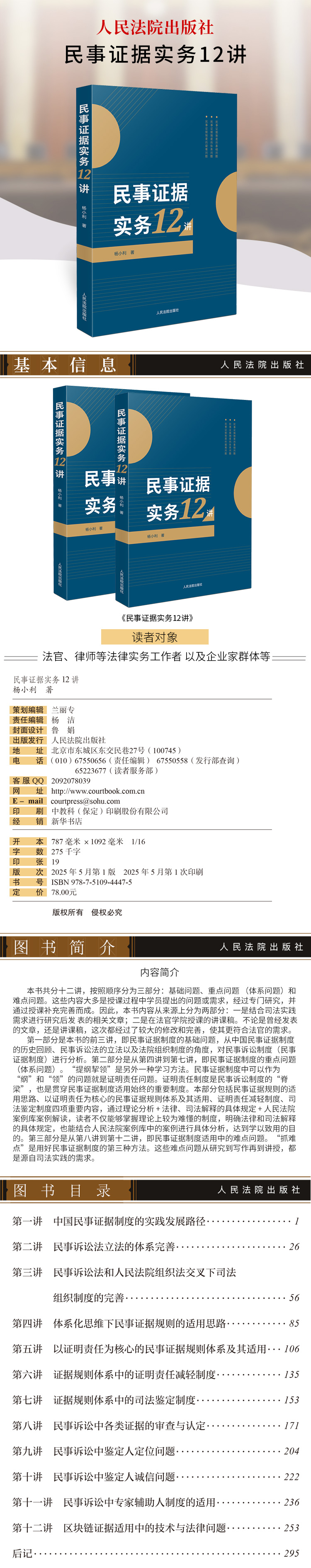 第一部分是本书的前三讲,即民事证据制度的基础问题,从中国民事证据制度的历史回顾、民事诉讼法的立法以及法院组织制度的角度,对民事诉讼制度(民事证据制度)进行分析。第二部分是从第四讲到第七讲,即民事证据制度的重点问题(体系问题)。“提纲挈领”是另外一种学习方法。民事证据制度中可以作为“纲”和“领”的问题就是证明责任问题。证明责任制度是民事诉讼制度的“脊梁”,也是贯穿民事证据制度适用始终的重要制度。本部分包括民事证据规则的适用思路、以证明责任为核心的民事证据规则体系及其适用、证明责任减轻制度、司法鉴定制度四项重要内容,通过理论分析 + 法律、司法解释的具体规定 + 人民法院案例库案例解读,读者不仅能够掌握理论上较为难懂的制度,明确法律和司法解释的具体规定,也能结合人民法院案例库中的案例进行具体分析,达到学以致用的目的。第三部分是从第八讲到第十二讲,即民事证据制度适用中的难点问题。“抓难点”是用好民事证据制度的第三种方法。这些难点问题从研究到写作再到讲授,都是源自司法实践的需求。
