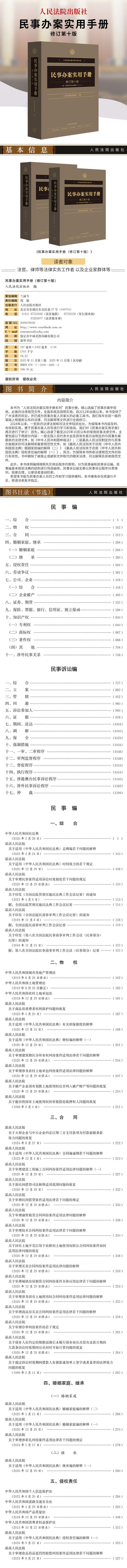 2024年以来,一些新的法律法规和司法文件陆续出台,为保障本书内容及时、有效和实用,便于民事办案人员等进行学习和查阅,我们对《民事办案实用手册》再次进行了修订:首先,精心选录了截至2025年10月公布的常用民事法律文件,主要包括以下两部分内容:一是全国人民代表大会及其常务委员会制定的与民事办案相关的法律文件,如《中华人民共和国仲裁法》;二是最高人民法院制定的与民事办案相关的司法解释和重要规范性文件,如《最高人民法院关于适用〈中华人民共和国民法典〉婚姻家庭编的解释(二)》《最高人民法院关于适用〈中华人民共和国民法典〉侵权责任编的解释(一)》。其次,为保障本书所收法律规范文件的现行有效性,书中删除了被废止或被新文件取代的相关法律、司法解释及其他规范文件。