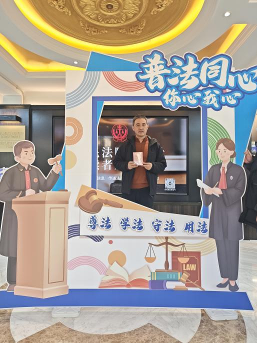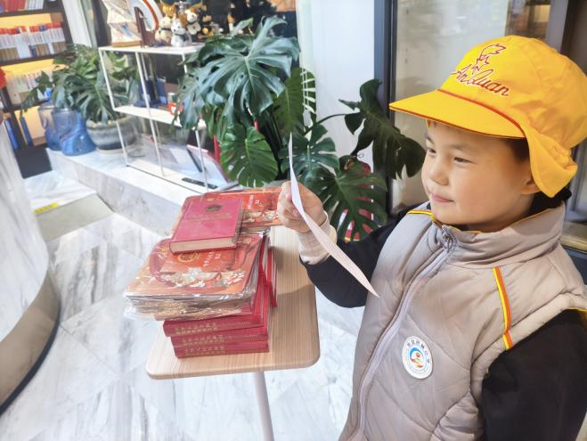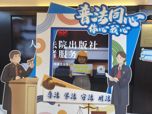 法信书店在核心区域打造“宪法与生活”专题书展,集中陈列《中华人民共和国宪法》及相关法律读物、民法典解读、法治教育普及类图书,构建系统化的法治学习资源矩阵。展区同步设置 “普法同心 你心我心” 互动打卡点,融合法官形象、法槌等法治元素,搭配趣味合影框,吸引读者手持国家宪法日主题读物拍照留念。该设计既延续书店 “以书载法、以景融法” 的特色,也契合年轻群体偏好,成为活动亮点之一。